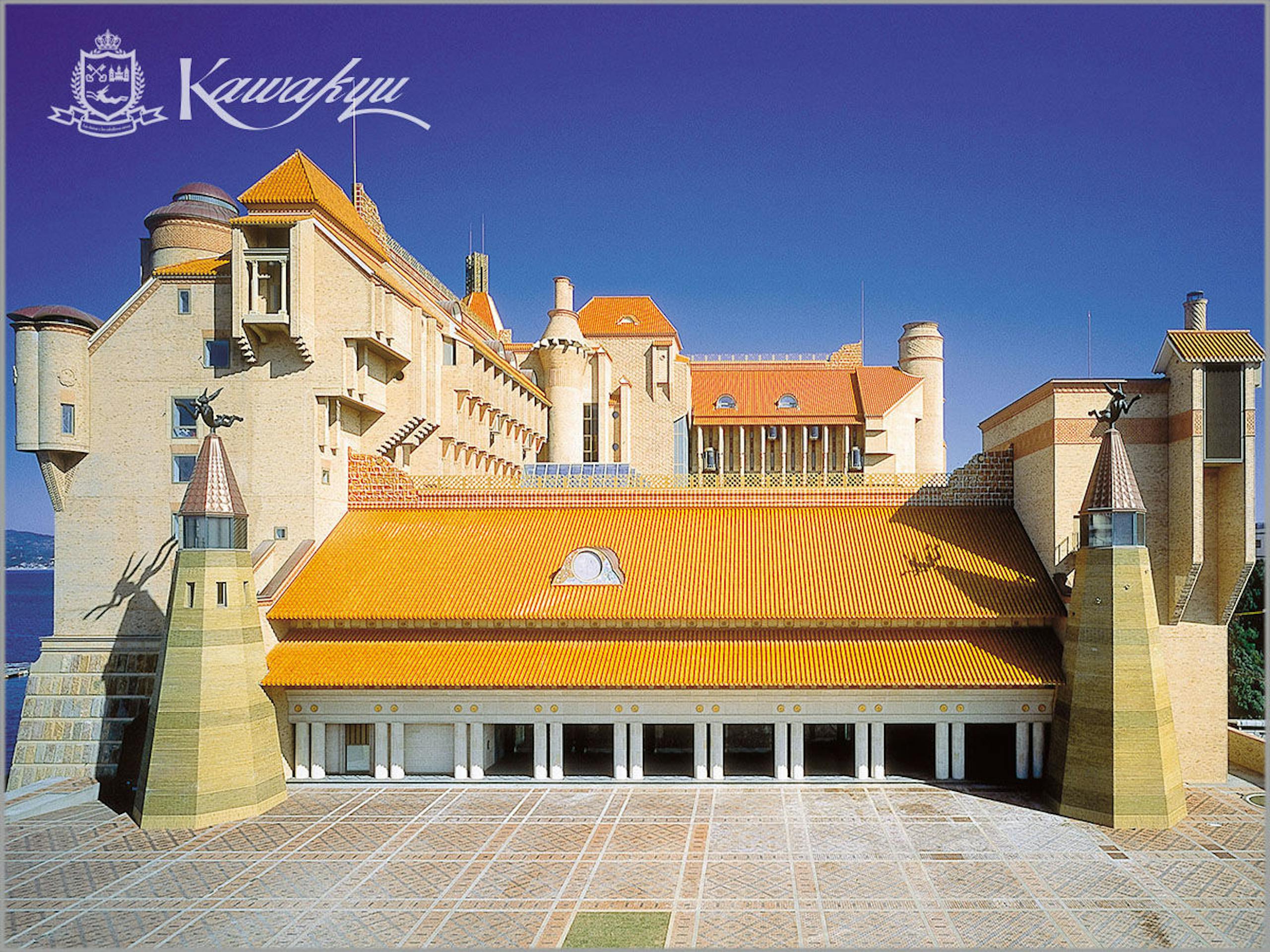 ホテル川久は、鮮やかな黄金色の屋根が目を惹く美術館の様なホテル。