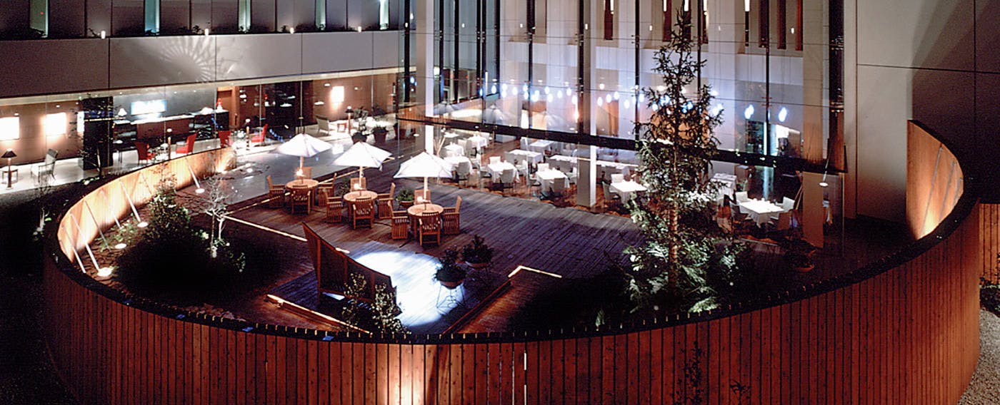 7階のメインフロア中心には吹き抜けの中庭が広がり、季節ごとのグリーンやホテルモリノのモチーフである「水車」のオブジェなどがあり、日々の喧騒を忘れさせてくれます。